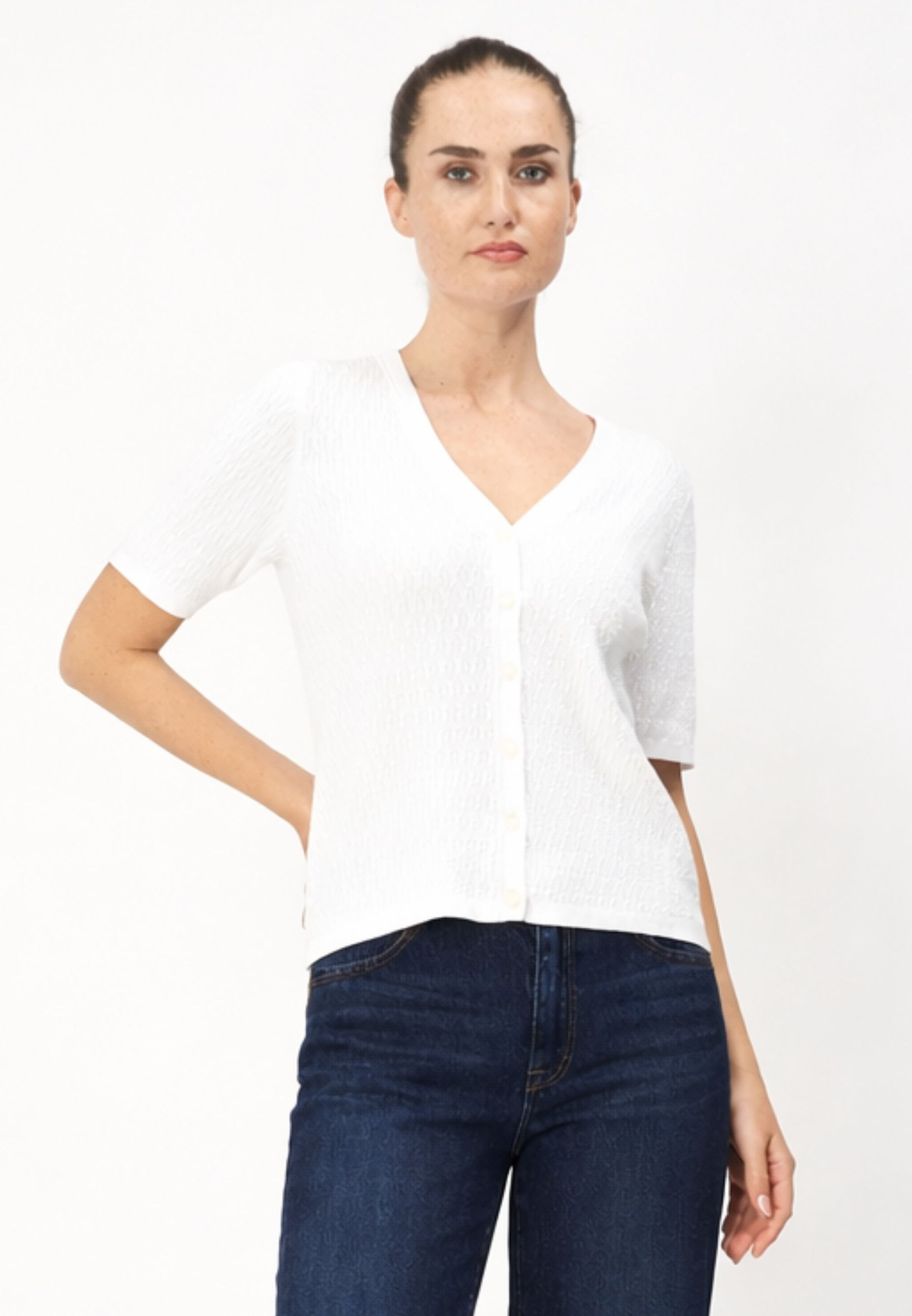 Ally er en flatterende kortærmet cardigan strikket i 100% bomuld. Den har en lige silhuet med en bred ribbet kant forneden. Ærmerne har manchetter ved enden. Cardiganen har en flatterende V-hals med fine knapper foran. Den perfekte del at bruge som cardigan eller som top!