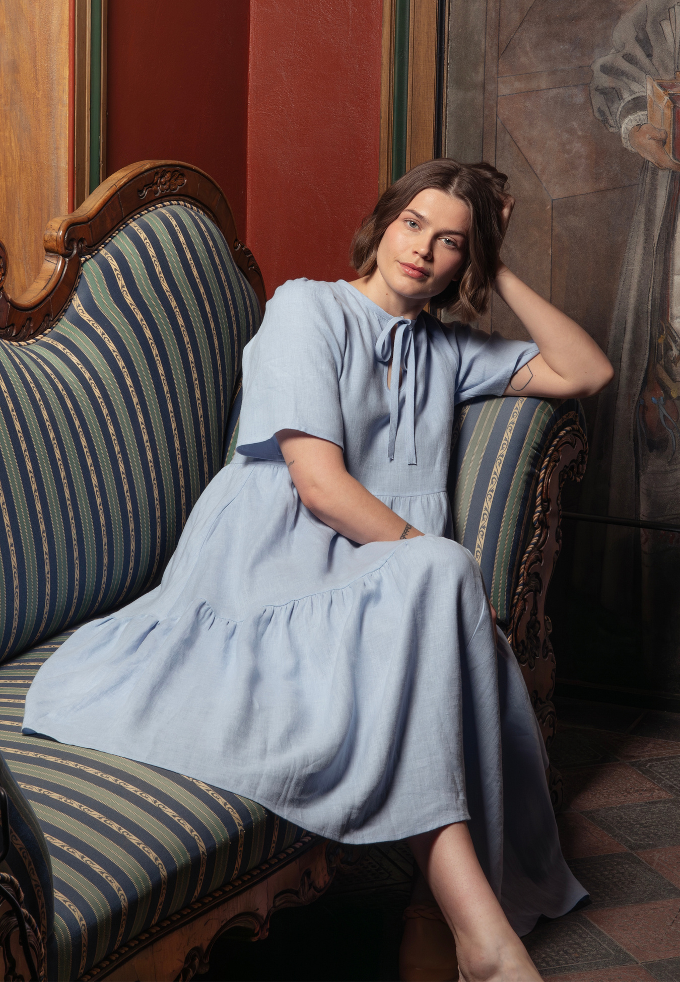Brita Dress er en del af vores limiterede kollektion skabt i samarbejde med Carl Larsson-gården i Sundborn. Designet tager udgangspunkt i de stribede tekstiler, der prægede hjemmet, og Karins måde at forene funktion og æstetik i hverdagen.