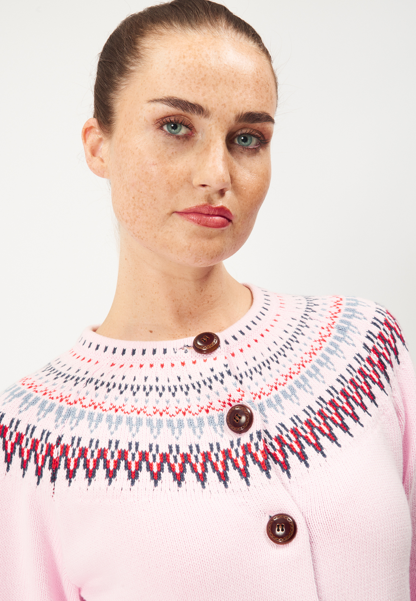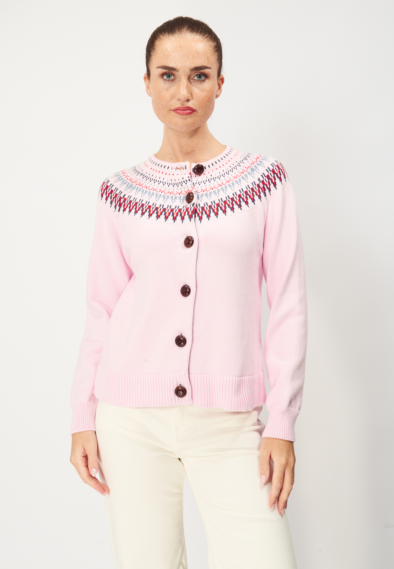 En dejlig strikket cardigan i 100 % bomuld med et folkloristisk mønster omkring bærestykket. Store træknapper foran. Lige, kort og løs pasform med lange ærmer. En sand klassiker!