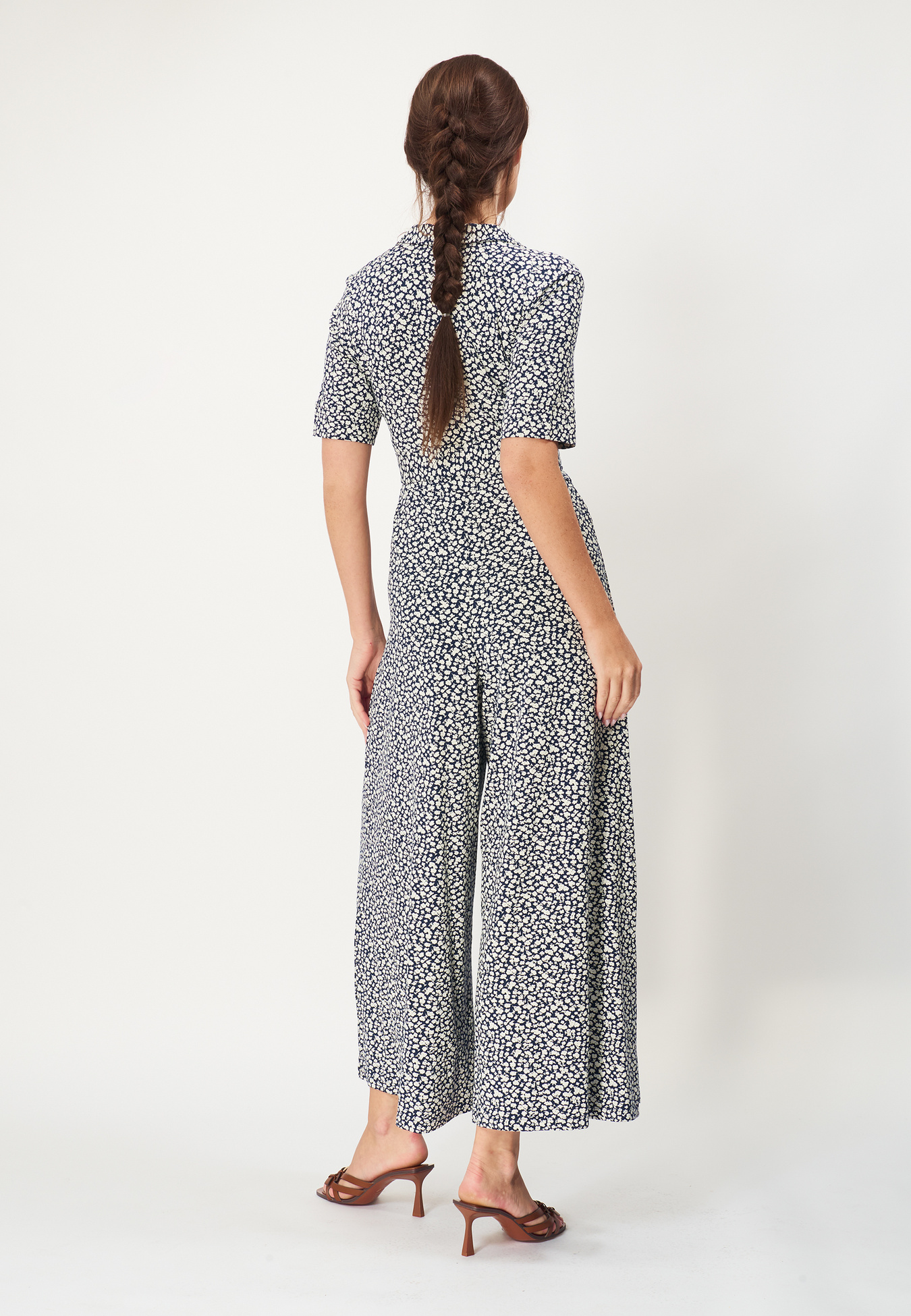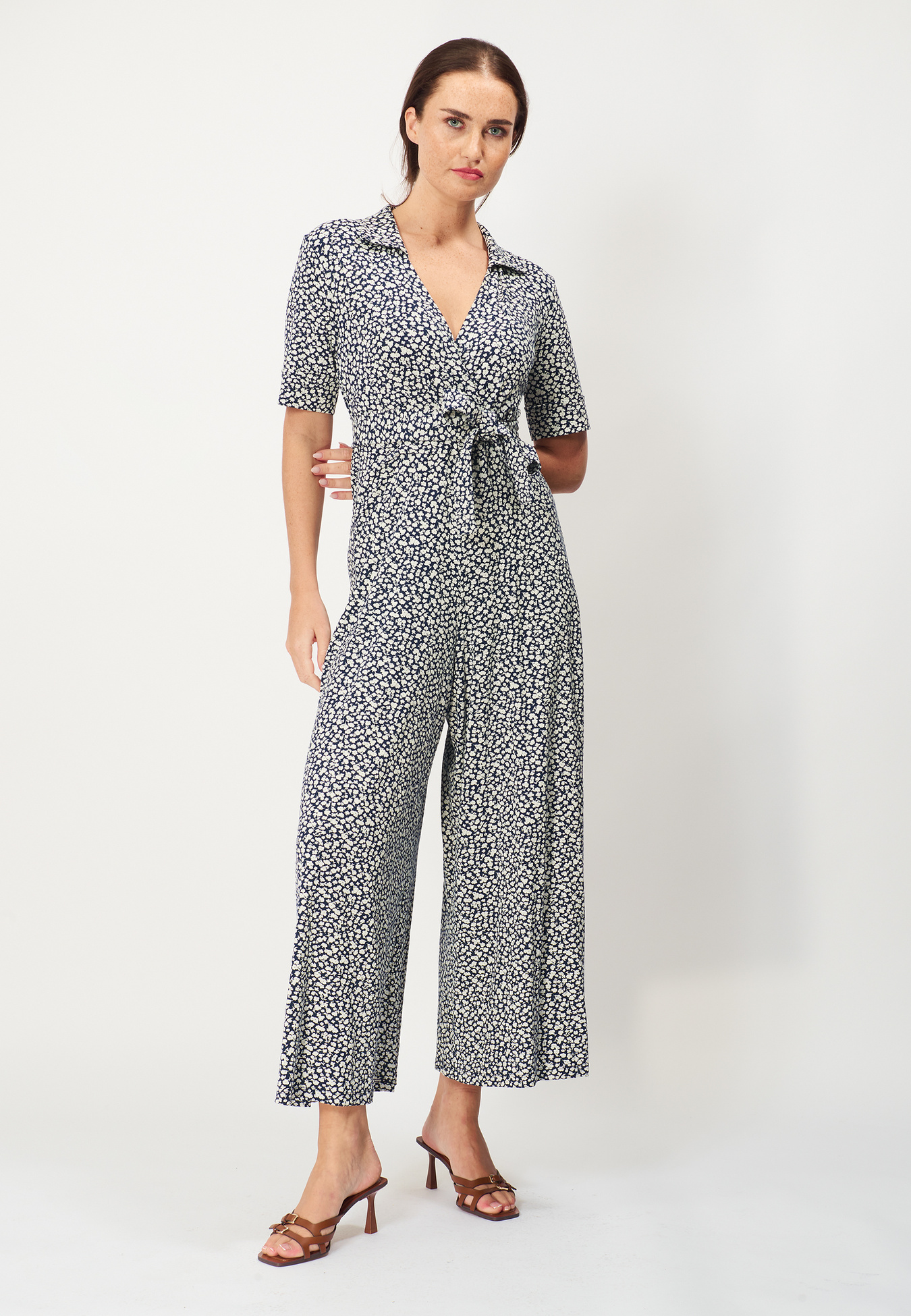 A very flattering jumpsuit in a viscose blend. The design features a fitted top with short sleeves and a wrap-style bodice. The three-quarter-length legs are wide at the bottom. Includes a detachable belt. The perfect jumpsuit for both casual and formal occasions!