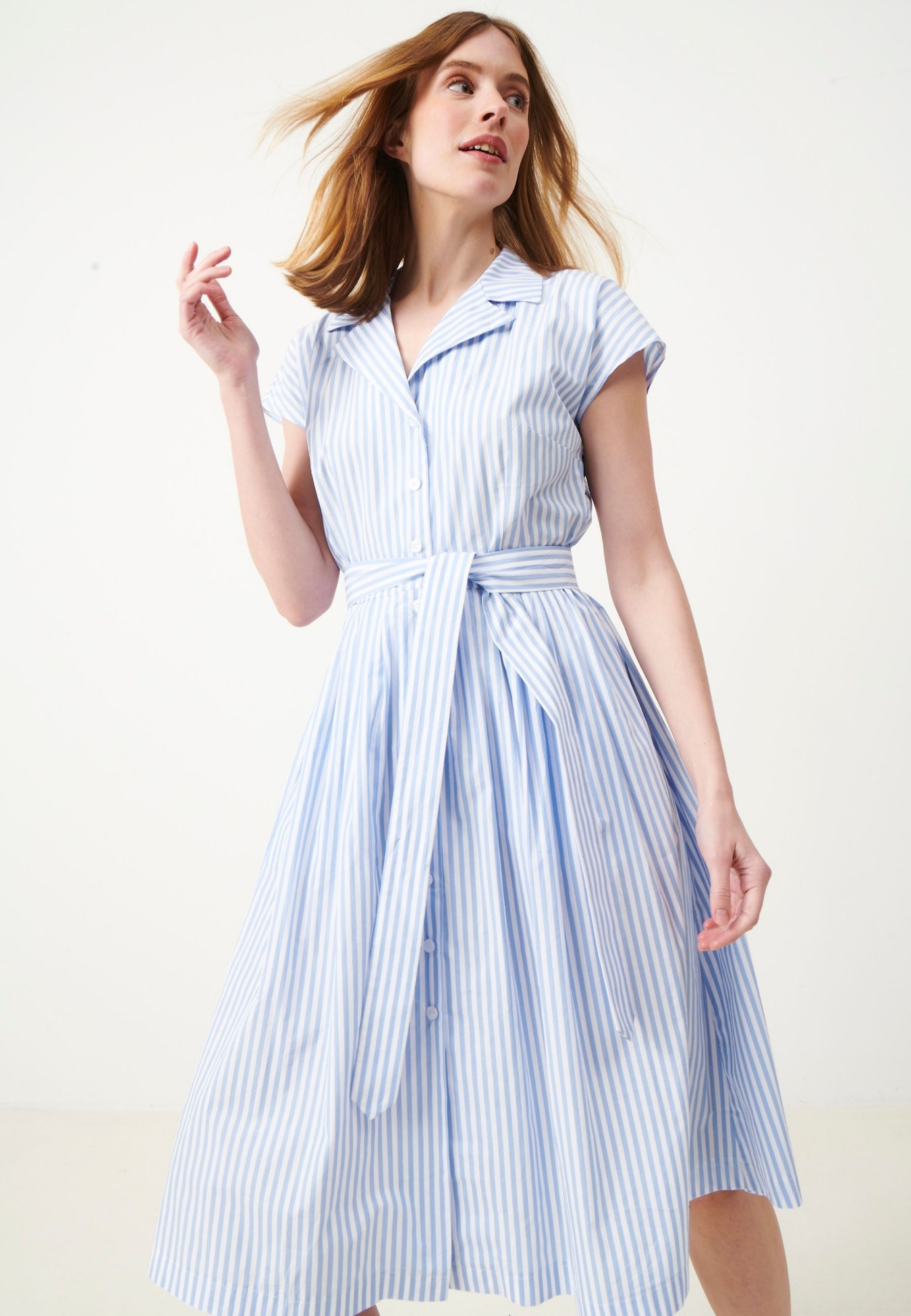 Freddie is a feminine shirt dress with a classic and easy silhouette. It features a collar, front button fastening and short sleeves for a relaxed look. The soft cotton fabric feels light and comfortable against the skin, while the waist is defined with a tie belt for an adjustable fit. The gently flared skirt creates a soft drape and natural movement. A timeless dress that is easy to wear again and again.
