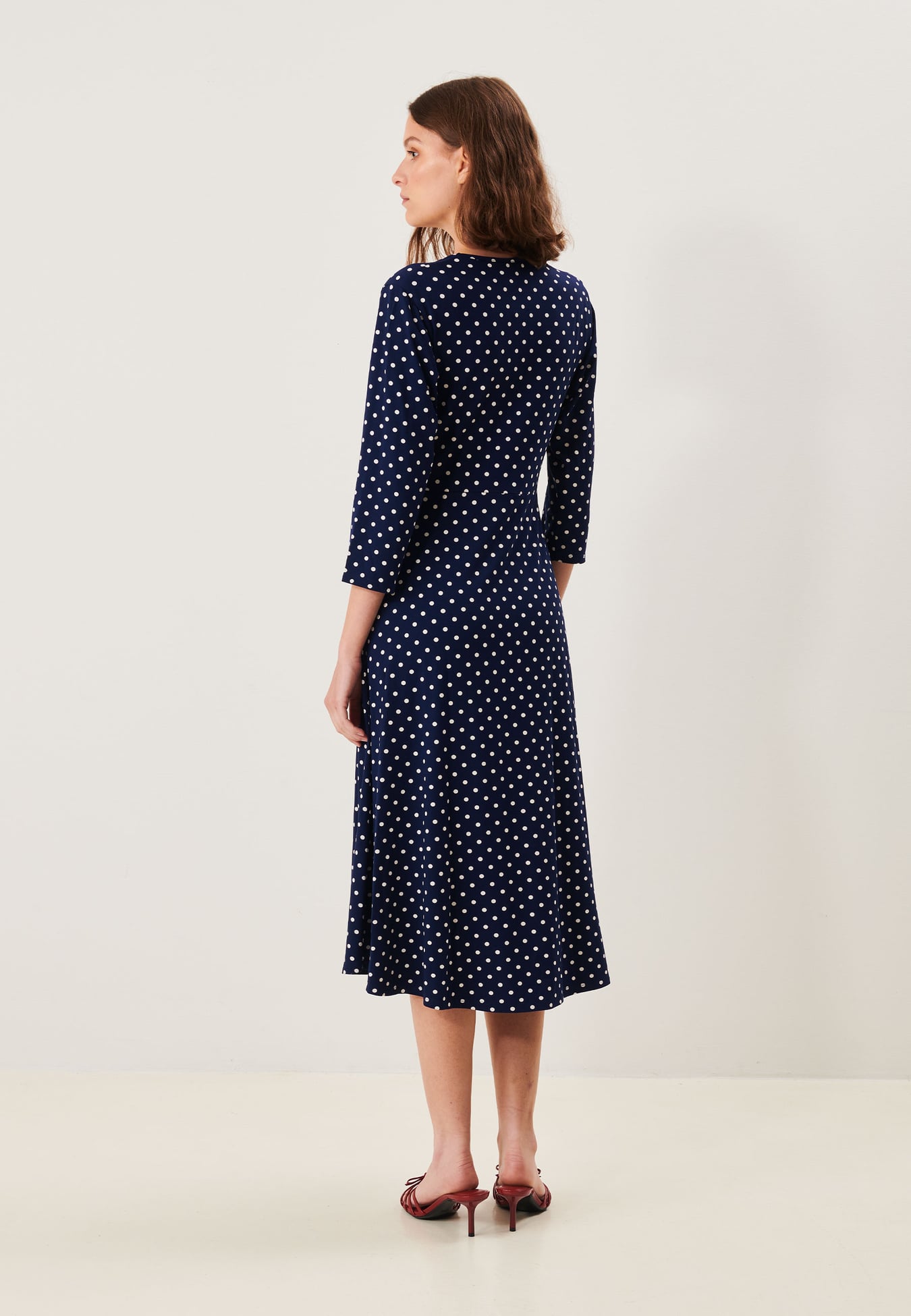 A soft and drapey dress in viscose with a classic dotted pattern that gives it a timeless and feminine feel. The flattering V-neckline and subtle gathering at the front accentuate the waist naturally, while the gently flared skirt adds beautiful movement and flow. The three-quarter sleeves and elegant silhouette make this a comfortable and stylish piece – an easy choice whether you dress it up or keep your look more relaxed. The material consists of 95% viscose and 5% elastane, giving the dress a soft, stretchy quality that feels good all day.
