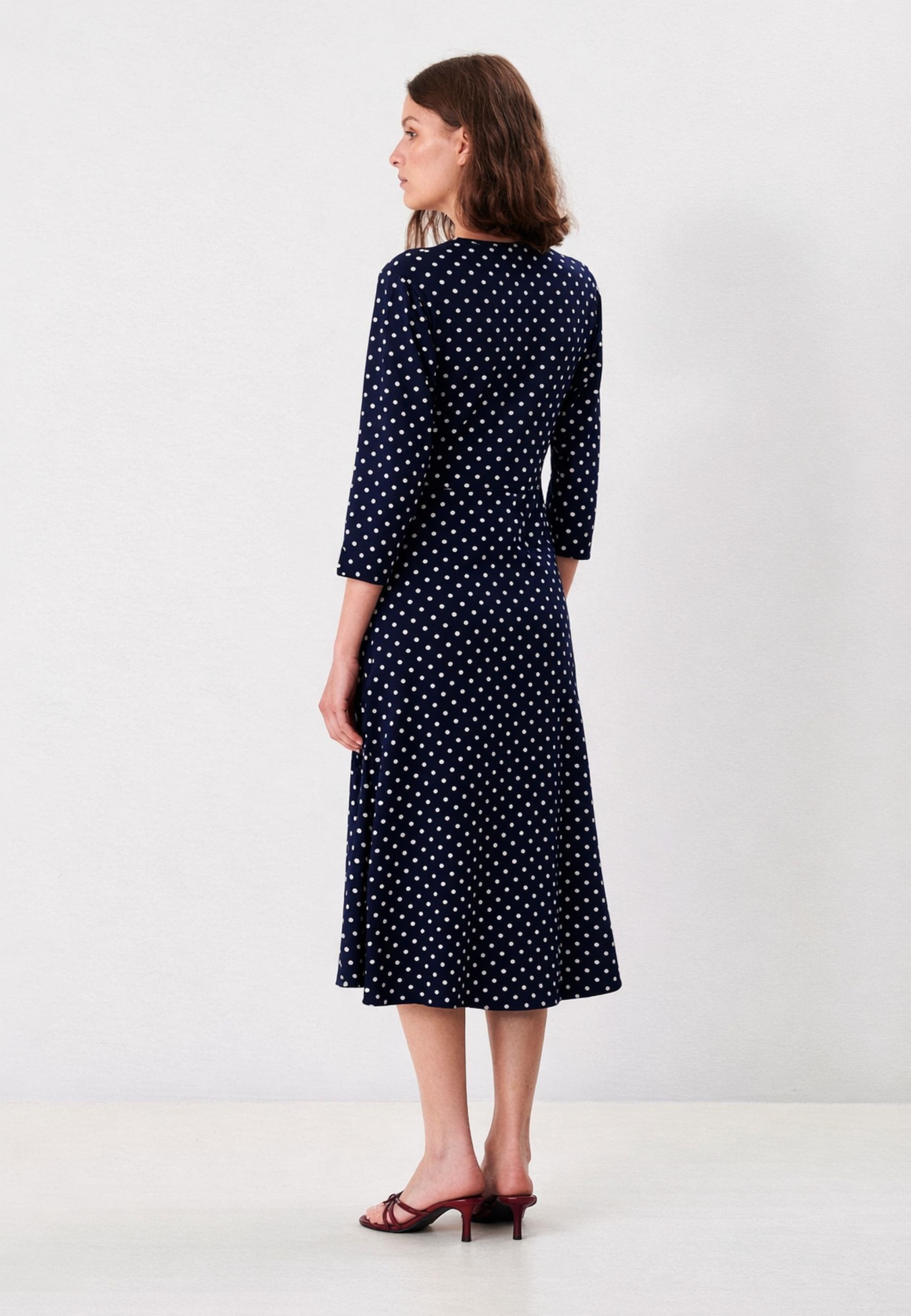 En mjuk och följsam klänning i viskos som ger en tidlös och feminin känsla. Den smickrande V-ringningen och det diskreta rynkpartiet framtill framhäver midjan på ett naturligt sätt, medan den mjukt utsvängda kjolen ger ett fint fall och rörelse. Modellen har trekvartslånga ärmar och en siluett som är både bekväm och elegant – ett plagg som snabbt blir ett självklart val oavsett om du klär upp dig eller håller stilen mer avslappnad. Materialet består av 95% viskos och 5% elastan, vilket ger en mjuk och stretchig kvalitet som känns skön hela dagen.